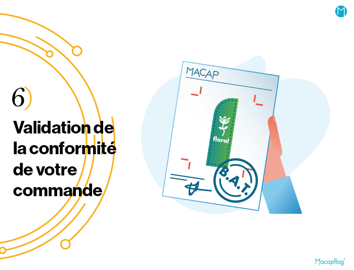 Avant de lancer l’impression de votre fichier, nous vous adressons un B.A.T. (Bon à Tirer) à valider par vos soins. Il récapitule l’ensemble des informations inhérentes à votre commande (quantité, couleurs, dimensions etc…). C’est la validation de ce document qui déclenche l’impression. C’est aussi le point de départ du délai de fabrication annoncé par votre interlocuteur Macap.