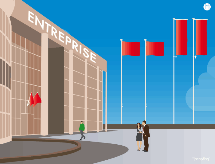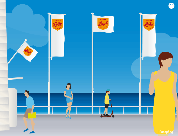 Pour une marque ou une entreprise, le drapeau personnalisé pour mât est souvent installé en complément d’une enseigne. Si cette dernière est statique, le drapeau représente un espace de communication dynamique et animé qui flotte au gré du vent.