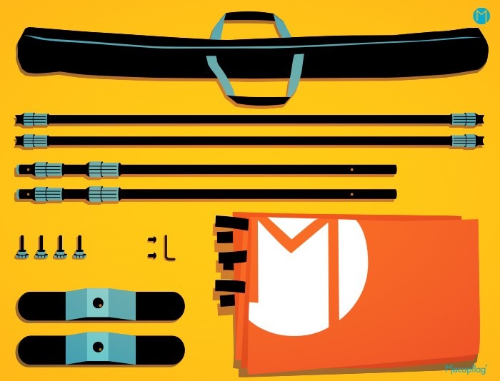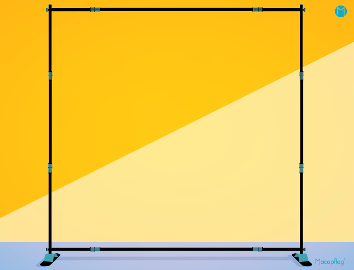 Des attaches velcros sont cousues sur les côtés du tissu. Elles s’enroulent ainsi facilement sur chaque mât télescopique et assurent la tension du visuel. Le mur d’image est réglable. Les dimensions minimales sont de 130 x 94.5 cm et les dimensions maximales de 233 x 230 cm.
