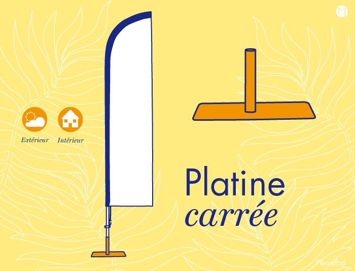 Vous pouvez acheter votre beach flag avec un ou plusieurs pieds adaptés à vos besoins. Le pied le plus couramment vendu pour un usage majoritairement indoor est la platine carrée. Noire, plate, discrète, elle est parfaitement adaptée aux sols plats. Pour assurer la tenue d’un oriflamme en extérieur, même avec un vent relativement fort, le pied en croix est préféré. Pour des mises en situation spécifiques, le pied autocal pour la concession auto moto, le pied forant adapté aux terrains meubles, le pied en acier à planter dans le sable sont quelques exemples de solutions développées pour répondre à des besoins précis.