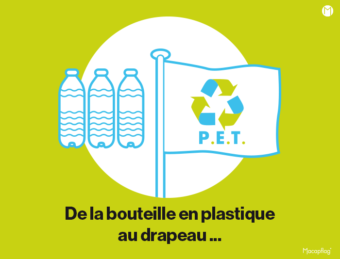 Un drapeau PET est donc un drapeau confectionné avec du textile provenant de bouteilles en plastiques recyclées. Une solution d’avenir, 100% recyclable 100% développement durable.