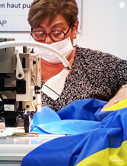 Puis les couturières Macap interviennent pour le travail de confection et de finition : la couture des ourlets, d’un galon ou d’une frange sur le pourtour du drapeau, celle d’une sangle de renfort, la pose des anneaux sont autant de possibilités qui vous permettent de recevoir exactement le drapeau ukrainien que vous voulez.