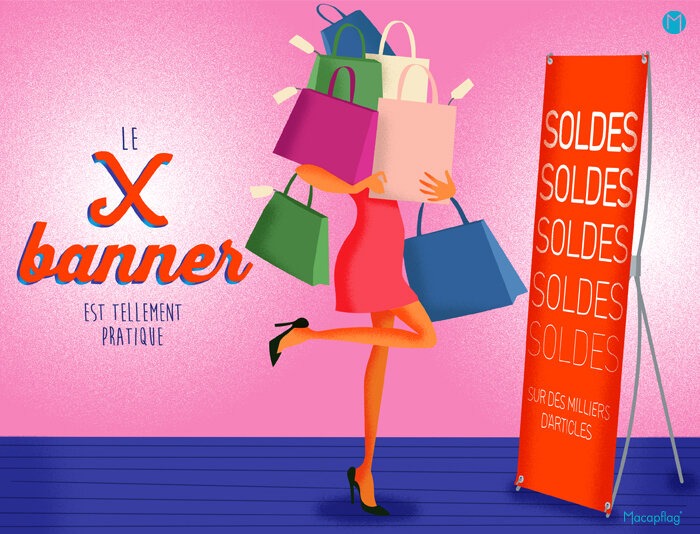 Le X banner est un support publicitaire imprimé composé d’un visuel rectangulaire en pvc avec un œillet à chaque angle se fixant sur une structure en fibre de verre en forme de X (d’où son nom, le X banner …).