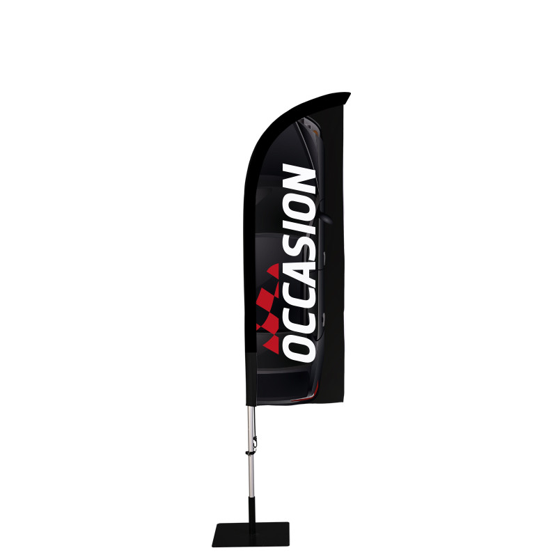 . Un mât d’une hauteur de 2.30 m, une voile personnalisée 160x50 cm dotée d’un fourreau noir, un pied carré robuste en acier noir 40x40 cm (6.5 kg)