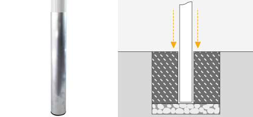 Les mâts en aluminium sont fixés grâce à un système de fourreau scellé dans un bloc de béton préalablement installé :