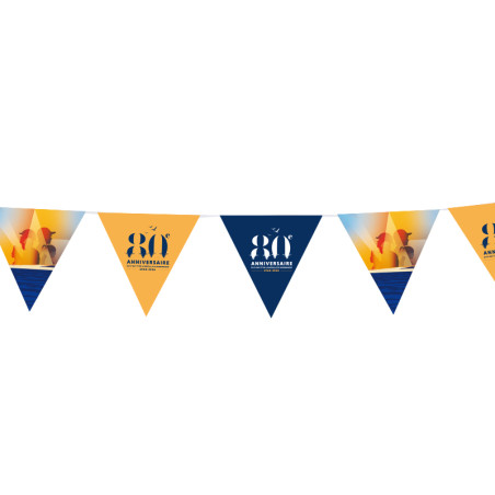 La guirlande est composée de 20 fanions triangulaires (20 x 20 cm) disposés sur une longueur de 10 mètres. La guirlande D-Day est personnalisée aux couleurs officielles des 80 ans du débarquement en Normandie par impression numérique.
