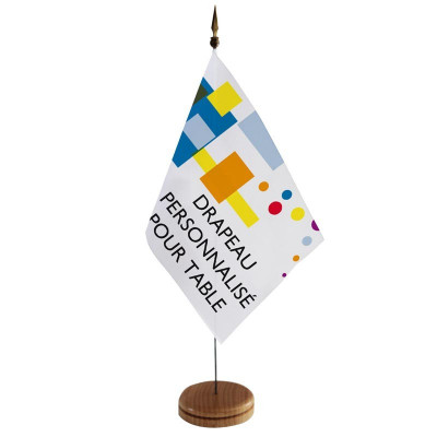 Posé sur son socle, ce petit drapeau en textile polyester décore discrètement mais efficacement les tables de cocktails ou le bar des loges. Il se déplace facilement au gré de vos besoins. Il est également totalement personnalisable.