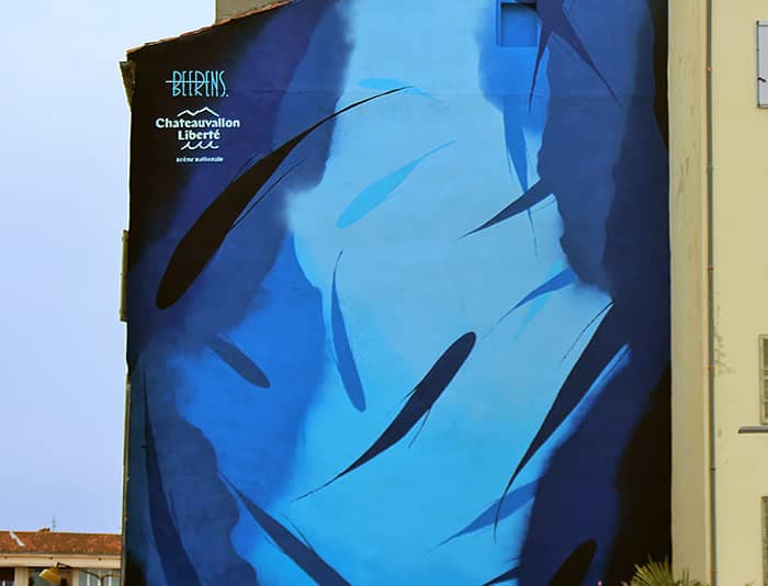 Cette immense fresque qui domine aujourd’hui le port de Toulon a été inspirée par une plongée de l’artiste dans l’anse Méjean, un lieu bien connu du littoral toulonnais. Michael Beerens explique que son œuvre fait écho à l’interaction entre la lumière et le motif aquatique, particulière dans ce site méditerrannéen.