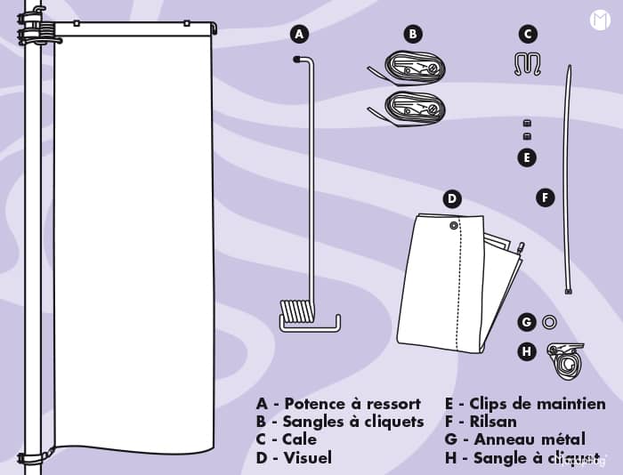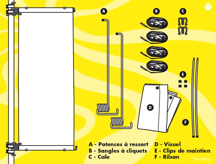 On appelle potence à ressort la fixation en acier galvanisé qui s’installe sur tout lampadaire ou candélabre d’un diamètre compris entre 8 à 50 cm. Cette pièce permet d’afficher un visuel imprimé sur du textile ou du pvc.