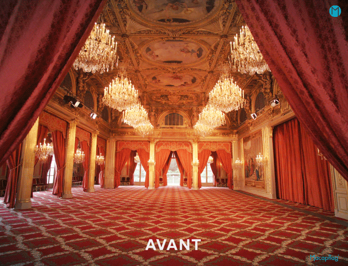 Fin 2018, la salle des fêtes de l’Elysée a également été totalement rénovée pour devenir moins dorée et plus lumineuse. Les tons grisés sont venus remplacer les dorures et le rouge empire. Si le coût de cette réfection a fait grincer des dents certaines personnes en pleine crise des gilets jaunes, elle s’intègre néanmoins dans un plan de communication bien établi. Le président Macron l’a dit lui-même, il souhaite faire de l’Elysée une vitrine de la France.