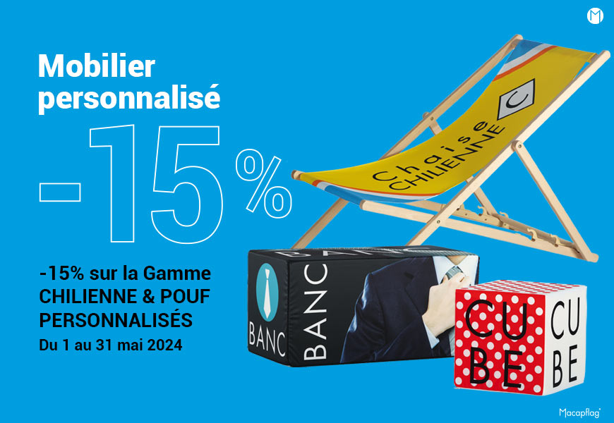 Du jeudi 1 au samedi 31 mai 2025, bénéficiez de 15 % de remise immédiate sur les chiliennes et les poufs personnalisés achetés en ligne directement sur le site fabricant de Macap.