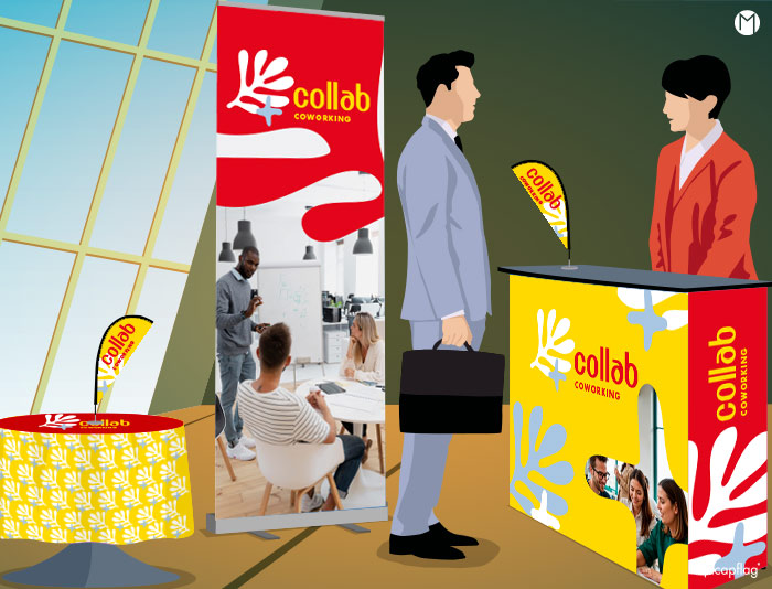 - Dans une salle de réunion, un cadre toile tendu habille l’un des pans de mur, une nappe publicitaire et un chemin de table recouvrent la table.