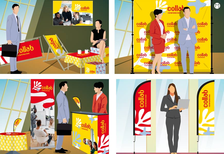 - En intérieur, le hall d’accueil des locaux a été décoré avec un rollup imprimé et des poufs cubes imprimés. Au mur, des cadres toiles tendues ont été fixés avec des photos des produits de la maison en situation. Sur le comptoir d’accueil, on a posé un deskflag logoté aux couleurs de la marque.
