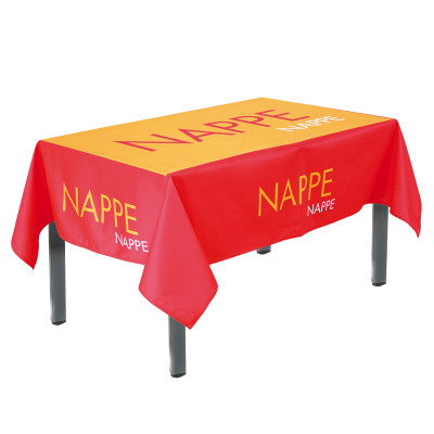 Confectionnée, elle aussi, en textile Polydéco 220 g/m², la nappe personnalisée est un autre support idéal pour les vendeurs forains. Pratique, lavable en machine, sa personnalisation par impression numérique en fait un support aussi pratique qu’utile. Les dimensions de la nappe lui permettent de recouvrir une table avec, selon sa longueur, une retombée sur les côtés. Elle se plie en prenant très peu de place.