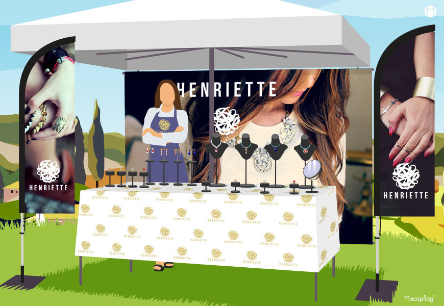 Personnalisés harmonieusement, la nappe et le kakémono créent un ensemble à la foi esthétique et impactant pour vous démarquer des autres stands.
