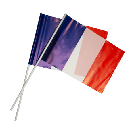 Le drapeau en plastique transparent à agiter au format 20 x 30 cm avec sa hampe collée d'une longueur 45 cm. Vendu par lot de 100, le petit drapeau français est imprimé sur un plastique transparent.