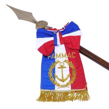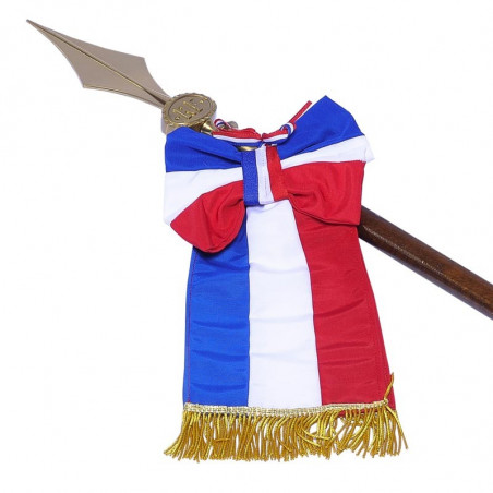 La cravate tricolore se positionne au sommet de la hampe de défilé, sous la flèche. Elle est proposée ici dans sa version bleu blanc rouge mais elle existe aussi de couleur noire pour la cravate de deuil.