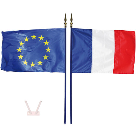 Spécialement conçu pour répondre à la réglementation des écoles "loi Peillon", ce kit complet est composé d'un drapeau français et un drapeau de l'Union Européenne montés sur hampe officielle (gaine et flèche en plastique) avec la fixation de façade. Les drapeaux ont un format 60x90cm avec une longueur de hampe de 152 cm. La fixation, en acier laqué blanc haute résistance, positionne les deux drapeaux avec une inclinaison à 45° sur votre mur.