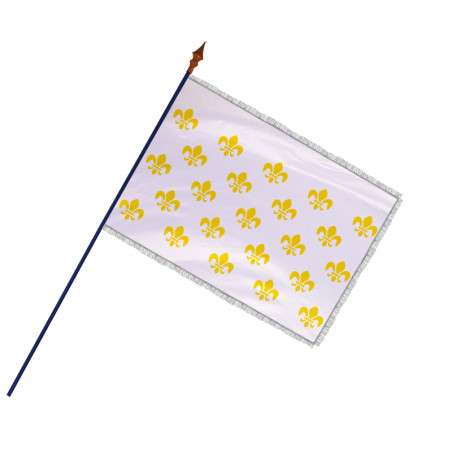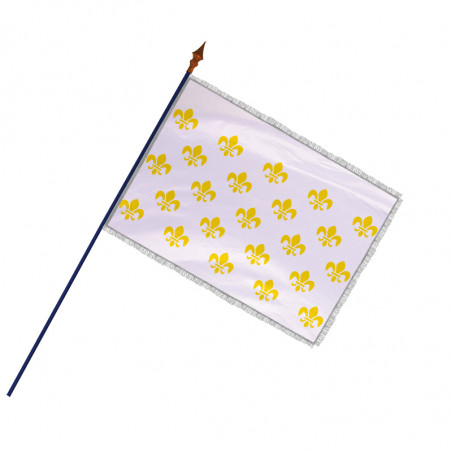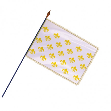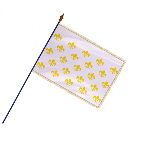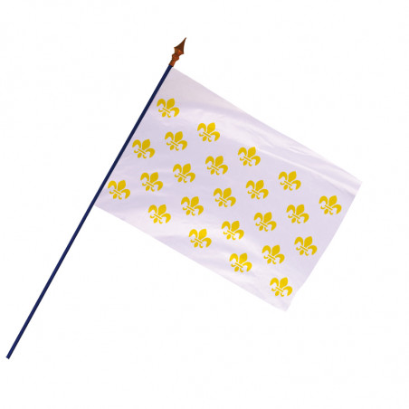 La fleur de lys, symbole de la royauté française, est ici représentée de couleur jaune or sur un fond blanc.Le drapeau imprimé fleurs de lys est proposé en différentes tailles. Quelles que soient les dimensions choisies, le drapeau est fixé sur une hampe en bois entourée de plastique bleu et surmontée d’une flamme de couleur bronze. L’ensemble est à la fois léger et solide pour vous permettre de l’agiter facilement et confortablement.