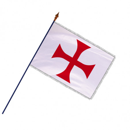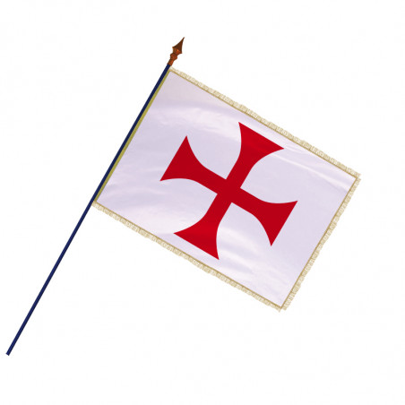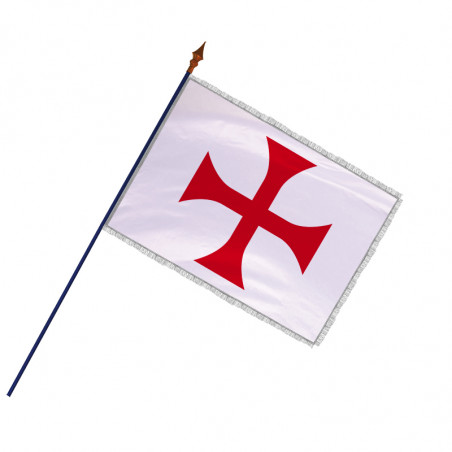 La croix des templiers, que l’on appelle aussi la croix du temple, est une croix historique devenue le symbole fort des templiers. Elle est de couleur rouge et se détache sur un fond blanc.Le drapeau des Templiers est ici décliné dans sa version drapeau sur hampe. Dimensions, matières, finitions, un large choix de personnalisations s’offre à vous.Dans toutes les tailles, le drapeau est fixé par agrafes sur une hampe en bois gainée de plastique bleu et surmontée d’une flèche de couleur bronze. L’ensemble est à la fois esthétique et léger.