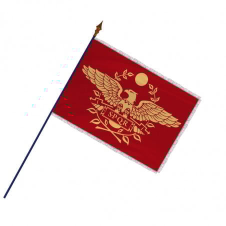 Ce drapeau de couleur rouge soutenu est imprimé du symbole de l’Empire Romain avec l’aigle impérial, la couronne ainsi que les lettres S. P. Q. R. qui signifient en latin "le sénat et le peuple romain". Cette devise abrégée est devenue l'emblème de la République romaine, puis par tradition de l'Empire romain. Proposé en différentes tailles, le drapeau est fixé sur une hampe en bois entourée d’une gaine en plastique bleue. Le drapeau sur sa hampe est facile à manier, léger et esthétique .Votre drapeau peut être orné sur le pourtour d’une frange ou d’un galon doré ou argenté ou plus simplement d’un ourlet.