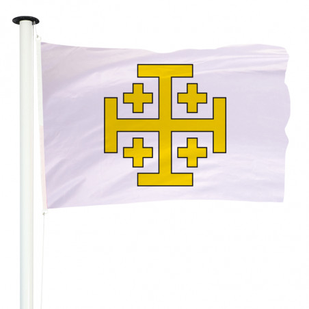 La croix de Terre Sainte ou croix de Jérusalem est un très ancien emblème des chrétiens d’Orient. On l’appelle aussi la croix à béquilles car chaque extrémité de branche se termine par une béquille. Les 4 petites croix représentent les quatre Évangiles ou les quatre directions vers lesquelles la parole du Christ s'est répandue à partir de Jérusalem.Le drapeau pour mât à drapeaux est personnalisé par impression numérique haute définition sur des matières alliant qualité robustesse et rendu esthétique. Un ourlet est cousu sur le pourtour ainsi qu’une sangle de renfort sur le côté avec deux anneaux de fixation.