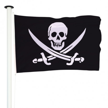 Voici un véritable drapeau de pirate avec son emblématique tête de mort avec épées blanches sur fond noir. Ce drapeau de pirate pour mât est fabriqué dans un tissu spécifiquement adapté aux drapeaux. Le motif est imprimé par impression numérique HD qui offre un rendu d’une qualité exceptionnelle avec une durabilité importante. Des ourlets sont cousus sur le pourtour du drapeau ainsi qu’une sangle de renfort assurant son maintien et sa tenue lorsqu’il est hissé sur son mât. Des anneaux agrémentent cette sangle pour faciliter la fixation du drapeau sur le mât.