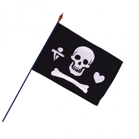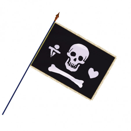 Brandissez votre drapeau de pirate pour mieux semer la terreur autour de vous !Plusieurs drapeaux de pirates sont proposés sur ce site. Celui-ci est fixé sur une hampe en bois gainée de plastique bleue et surmontée d’une flamme coloris bronze. Il est vendu en plusieurs tailles. Vous pouvez choisir de le faire fabriquer avec une frange ou un galon sur le contour. Ces finitions peuvent être dorées ou argentées. Votre drapeau peut aussi être cousu d’un ourlet discret.