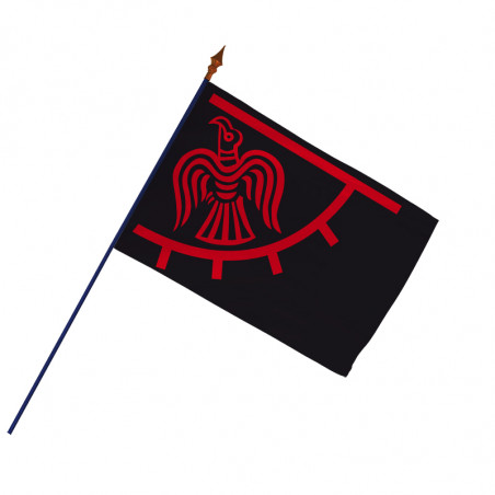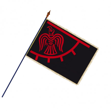 Embarquez pour une aventure historique avec notre Drapeau Viking personnalisé, minutieusement imprimé en noir et rouge par MACAP. Fabriqué en maille polyester robuste de 110 g/m², ce drapeau incarne la bravoure des Vikings. Fixé sur une hampe en bois gainée de bleu et coiffé d'une flèche en plastique couleur bronze, il se déploie avec fierté. Personnalisez-le avec des options de frange filée sur le pourtour et de galon en or ou argent pour une touche authentique.