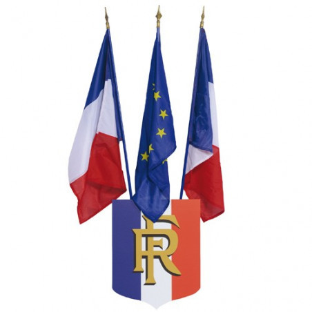 L' écusson porte-drapeaux est composé d'un PVC rigide et d'une ossature en bois pour accueillir de 1 à 5 drapeaux (ø max. de la hampe : 16 mm). Le blason tricolore mesure 50 x 40 cm et pèse 1.2 kg. Un large choix d'écusson pour drapeaux officiels est proposé : simple, avec RF, avec RF et palmes, Union Européenne (UE). Le système de fixation et la visserie sont livrés avec le blason, il est bien évidement à adapter en fonction du lieu d'implantation (support et exposition aux intempéries).