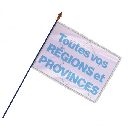 Le drapeau est agrafé sur une hampe en bois gainée bleue coiffée d’une flamme en plastique couleur bronze. Macap vous offre l'expertise d'une fabrication française depuis plus de 50 ans avec un respect total des coloris et du design de chaque province et région françaises. Chaque drapeau est proposé en plusieurs dimensions et avec plusieurs variantes de finitions : ourlets ou galons et franges dorés et argentés.