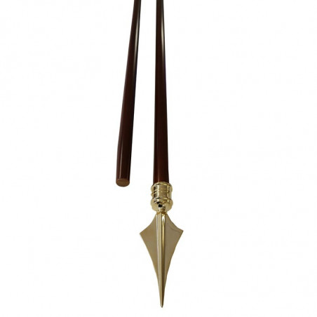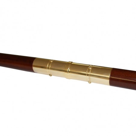 Proposée en 2 longueurs, 220 ou 242 centimètres, la hampe d’ornement est fabriquée en bois précieux et ornée d’une flamme en laiton dorée. Selon la longueur, elle pèsera entre 1.9 et 2.2 kg.