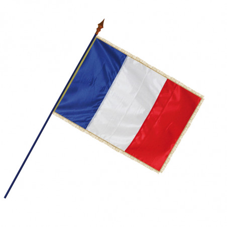 Ce drapeau français est agrafé sur une hampe en bois gainée bleue surmontée d’une flamme en plastique de couleur bronze. Il est disponible en de nombreuses dimensions et plusieurs options de finition sont proposées selon la vocation de ce drapeau (ourlets, galons, franges couleur or ou argent).