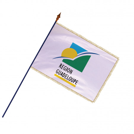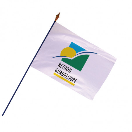 La charte graphique de la région Guadeloupe vous invite à voyager dans les Caraïbes, avec un visuel entre ciel, mer, soleil et mouette. Imprimé sur des imprimantes numériques de haute qualité restituant les couleurs bleue, jaune et verte, le drapeau est ensuite fixé sur une hampe en bois avec sa flèche.
