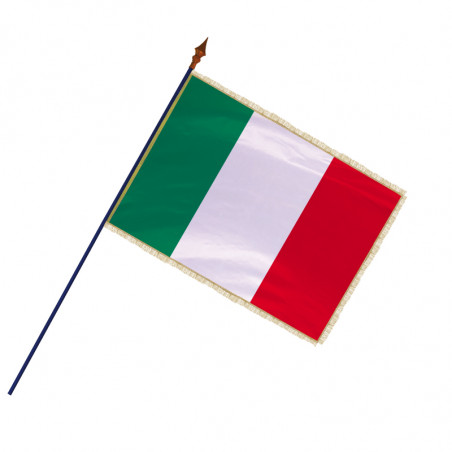 Le drapeau tricolore italien est présenté avec sa hampe officielle.
