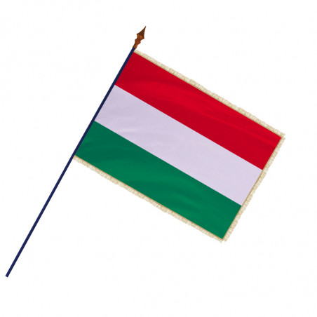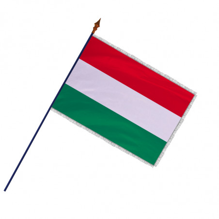 Le drapeau hongrois est ici proposé en différentes dimensions, avec différentes possibilités de finitions, fixé sur une hampe en bois gainée grâce à un système d’agrafage. La hampe est dotée d’une flèche dont la couleur rappelle celle du bronze.
