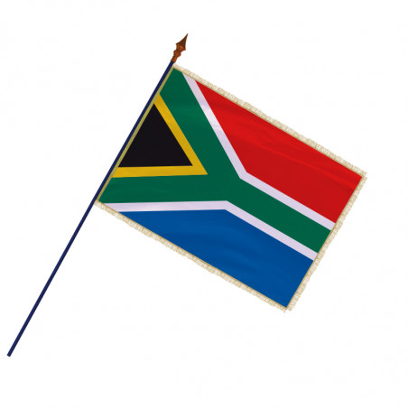 Le drapeau de l'Afrique du Sud, présenté avec sa hampe officielle, symbolise avec ses couleurs le vivre ensemble des habitants de ce pays. Officialisé le 27 avril 1994, c’est l’un des plus beaux drapeaux de l’Afrique. La couleur verte symbolise l’union pacifique entre les différentes ethnies, la couleur bleue et la couleur rouge celles des colons venus de Grande-Bretagne et des Pays-Bas. Le blanc représente la démocratie et le jaune les ressources minières du pays. La couleur noire est celle du peuple présent sur le territoire avant le temps de la colonisation.