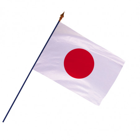 Le drapeau du Japon est agrafé sur une hampe en bois gainée de plastique bleu et surmontée d’une flèche, il est directement prêt à flotter au vent.