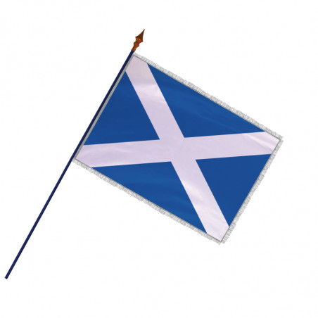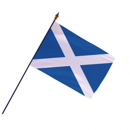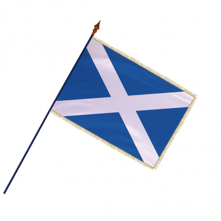 Le drapeau écossais est imprimé aux couleurs officielles du pays. Il est disponible en plusieurs dimensions avec des options de personnalisation pour assurer un aspect plus cérémonial (frange et galon dorés ou argentés). Le drapeau est fixé sur sa hampe en bois gainée et surmontée d’une flèche.