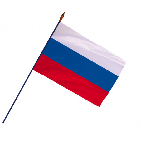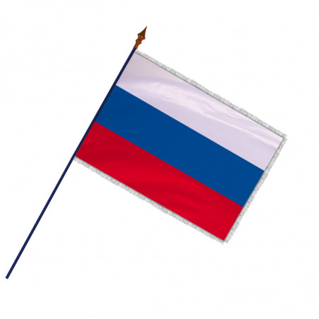 Le drapeau de la Russie, présenté avec un choix de dimensions et de finitions, est agrafé sur une hampe en bois recouverte d’une gaine bleue et surmontée d’une flèche de couleur bronze.