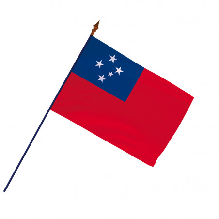 Le drapeau Samoa est monté sur une hampe en bois gainée bleue surmontée d'une flamme en plastique couleur bronze. Le drapeau officiel Samoa est disponible à l'achat dans de nombreuses déclinaisons. Nous vendons le drapeau dans des dimensions standards et nous proposons également un fabrication française sur mesure.