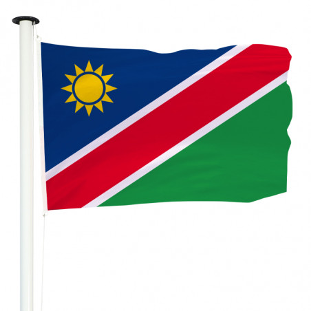 Le drapeau de la Namibie pour mât, adopté depuis 1990, se symbolise par ses couleurs la nature du pays et le sang de l'indépendance : le bleu pour le ciel et l'océan atlantique, le vert pour les ressources naturelles et la terre agricole, le rouge pour le sang de la liberté et le jaune du soleil pour la puissance et la vie. Le pavillon Namibie est disponible dans des formats sur mesure et standards fabriqués par nos soins en France dans une qualité certifiée.