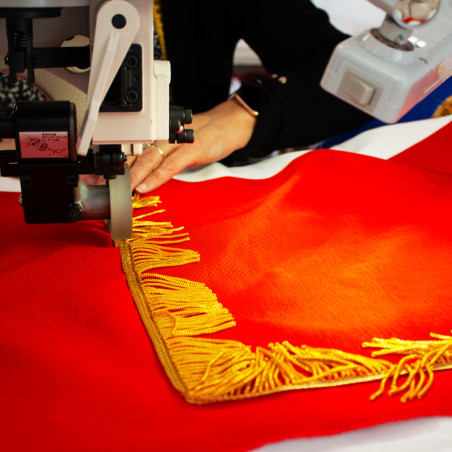 La fabrication du drapeau français brodé est entièrement réalisée dans nos ateliers avec un savoir faire de + de 55 ans certifiée par une triple certification ISO. Nous vous accompagnons avec la mise à disposition d'un service sur mesure de création visuelle. La personnalisation de votre drapeau est proposée sur une face ou deux faces. Idéal pour les cérémonies officielles, ce drapeau prestige allie qualité française et personnalisation complète. Disponible en plusieurs dimensions dans les meilleurs délais.