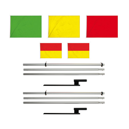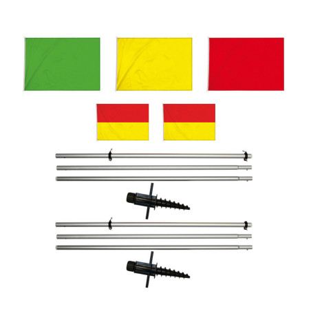 Ce lot essentiel de drapeaux de plage est composé des 5 drapeaux de surveillance de baignade obligatoires depuis la nouvelle réglementation du 31/01/2022 avec 3 drapeaux de baignade vert, jaune, rouge (format 125 x 150 cm) et de 2 drapeaux de zone de baignade surveillée bicolore jaune et rouge (format 75 x 90 cm). Les drapeaux de baignade sont imprimés sur une maille polyester résistante (110 g/m²) et confectionnés avec ourlets sur trois côtés. Une sangle de renfort sur le côté du drapeau assure la solidité des 2 anneaux de fixation.