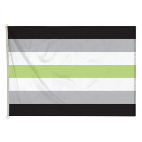 Le drapeau agenre est une déclinaison du drapeau LGBT. Il a été créé par Salem X en 2014 avec l’objectif d’augmenter la visibilité et de clarifier la position des personnes qui rejettent entièrement ou partiellement l'idée même du genre et ressentent une absence totale ou partielle de genre. Les bandes blanches et noires représentent l’absence de genre, le gris le fait d’être demisexuel, et la bande centrale verte le genre non-binaire.Le drapeau agenre est vendu ici dans des dimensions standards et sur-mesure. Quelles que soient les dimensions de drapeau choisies, il est confectionné avec un ourlet sur le pourtour et une sangle de renfort avec anneaux sur le côté gauche.