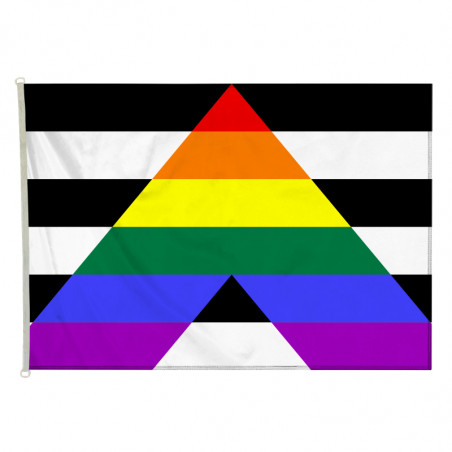 Le drapeau allié.e hétérosexuel.le représente les personnes hétérosexuelles ou cisgenres (c’est-à-dire celles dont le genre de naissance correspond à celui par lequel elles se définissent aujourd’hui) qui soutiennent les droits des différentes communautés LGBT +. Le drapeau reprend les couleurs du drapeau arc-en-ciel LGBT formant le “A” du mot Allié·e. Il est posé sur un fond de 6 bandes horizontales blanches et noires, couleurs du drapeau des hétérosexuels. Symbole de la lutte contre les LGBTphobies, le drapeau est vendu en plusieurs tailles et même en version sur mesure. Il est confectionné dans de la maille à drapeaux avec un ourlet. Son montage permet de le hisser sur un mât ou de simplement l’agiter à la main.
