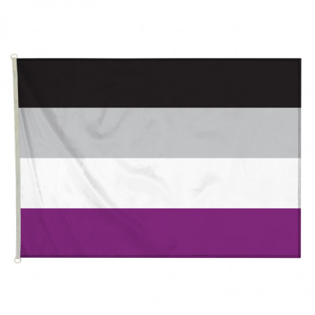 Le drapeau asexuel est une déclinaison du drapeau LGBT avec ses bandes horizontales de même largeur. Crée en 2010, il symbolise les personnes qui ne ressentent aucune attirance sexuelle quel que soit le sexe ou le genre. La bande noire représente l’asexualité, le gris la demisexualité, le blanc les alliés et le violet le symbole de la communauté. Le drapeau asexuel est proposé ici en différentes dimensions standards mais aussi sur-mesure. Quelle que soit la taille de drapeau choisie, il est fabriqué dans de la maille à drapeaux avec un ourlet sur le pourtour et une sangle de renfort avec anneaux sur le côté gauche. Votre drapeau peut ainsi être hissé sur un mât, être déployé à la main ou être porté sur un support vertical de votre choix.