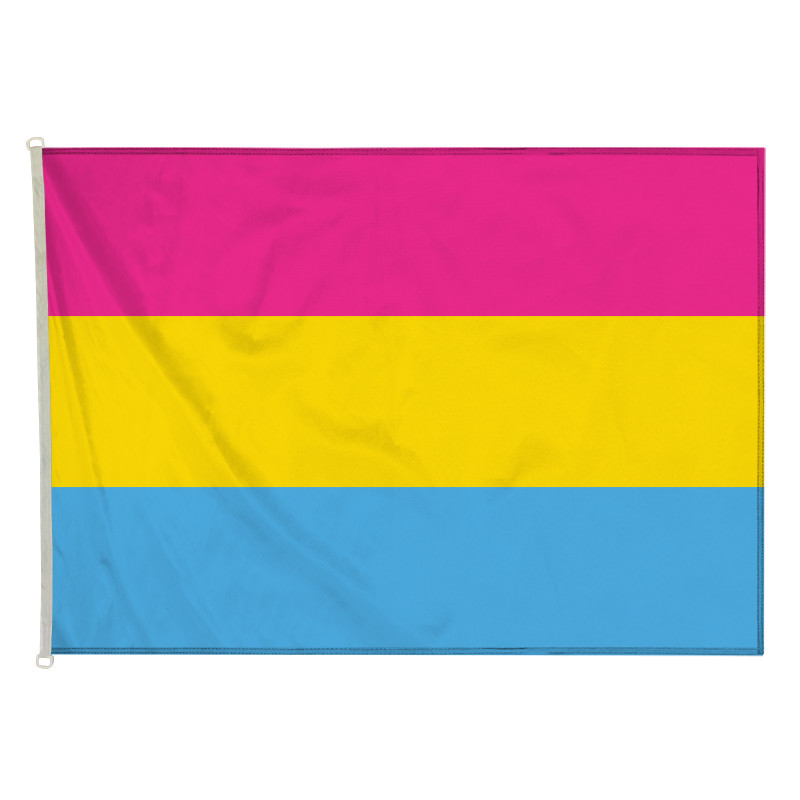 Crée en 1010, le drapeau pansexuel vise à représenter les personnes qui ressentent une attirance pour les autres, sans prendre en compte leur identité de genre. Les bandes rose et bleue représentent l’attraction pour des personnes définies femmes et hommes. La couleur jaune affiche l’idée que les pansexuels éprouvent de l’attirance pour toute personne se définissant autrement que par les genres binaires. Le drapeau pansexuel est vendu en ligne en différentes tailles et aussi sur-mesure. Il est fabriqué en maille à drapeaux qualitative, cousu d’un ourlet sur le pourtour et doté d’une sangle de renfort avec anneaux sur le côté gauche.