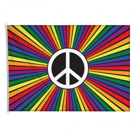 « Peace and love » que l’on peut traduire littéralement en français par « Paix et amour » est une expression qui signait la reconnaissance des hippies dans les années 60. Le symbole Peace and Love est un rond au sein duquel figurent 3 branches. Décliné sur un fond arc en ciel multicolore, il évoque la liberté et l’esprit des années 1960 et 1970.Le drapeau Peace and Love est imprimé sur un tissu que l’on appelle de la maille à drapeaux. Un ourlet est ensuite cousu sur son pourtour ainsi qu’une sangle de renfort sur le côté gauche.