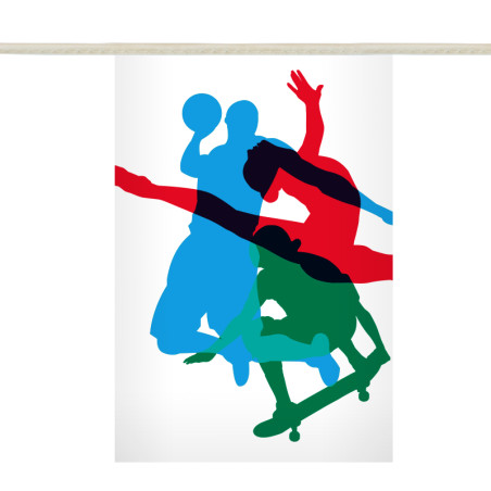 La guirlande est composée de 20 fanions drapeaux (30 x 20 cm) disposés sur une longueur de 10 mètres personnalisés par MACAP. Le design imprimé n'est pas la charte graphique officielle des JO ou de Paris 2024 qui est réglementée par un droit de reproduction et d'utilisation (copyright).